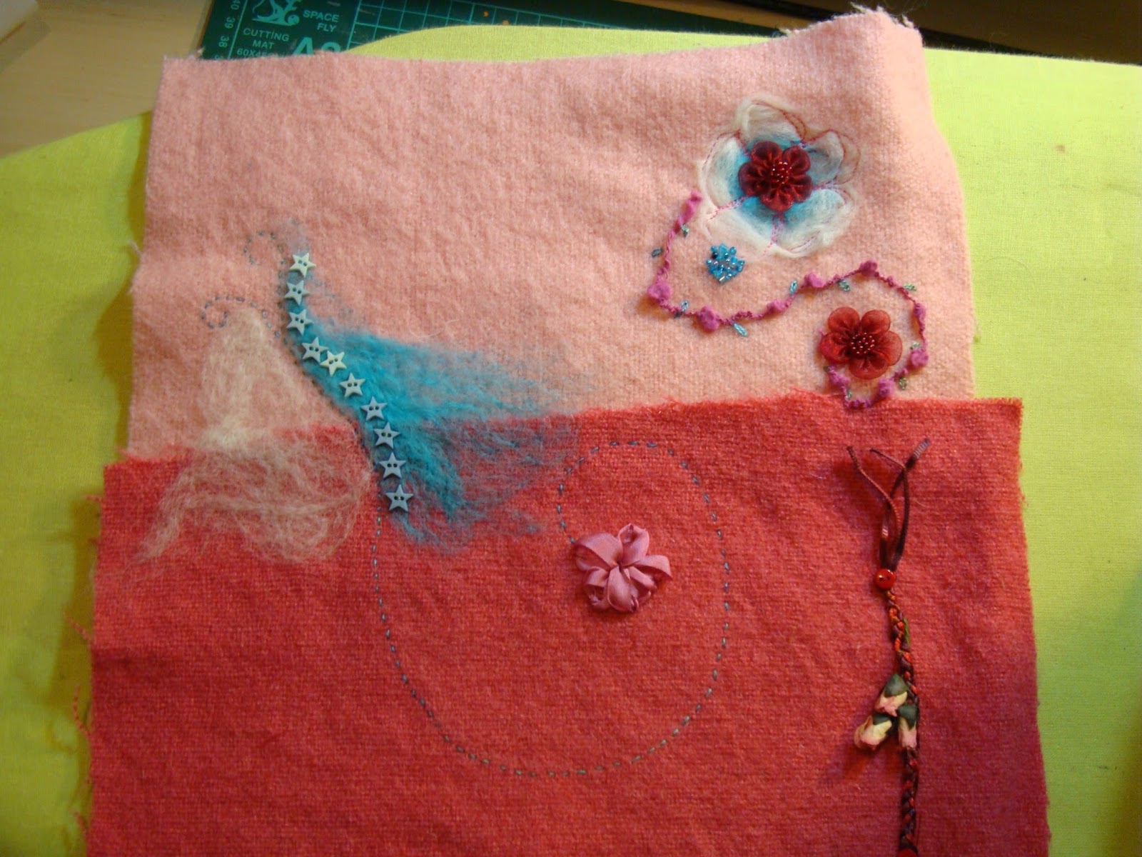 On Friday I went to visit some friends. We had been working on a Round Robin during the past few months and we finally got our own pieces back. This is mine. The background is a felted woollen woven fabric. The challenge now is to get our pieces completed for our next meeting in February.